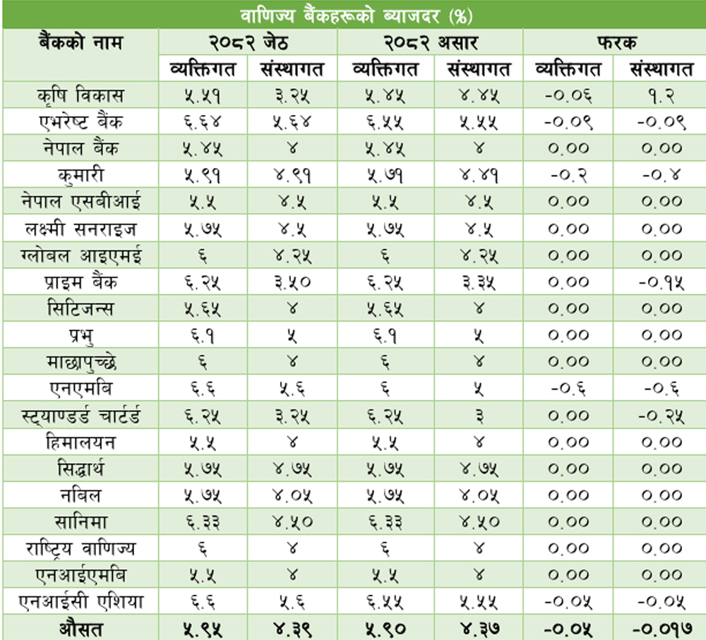 यससँगै असारमा बैंकहरुको औसत ब्याजदर व्यक्तिगततर्फ ५.९ प्रतिशत र संस्थागततर्फ ४.३७ प्रतिशतमा झरेको छ । जेठमा औसत व्यक्तिगततर्फ ५.९५२ प्रतिशत र संस्थागततर्फ ४.३९ प्रतिशत ब्याजदर थियो ।