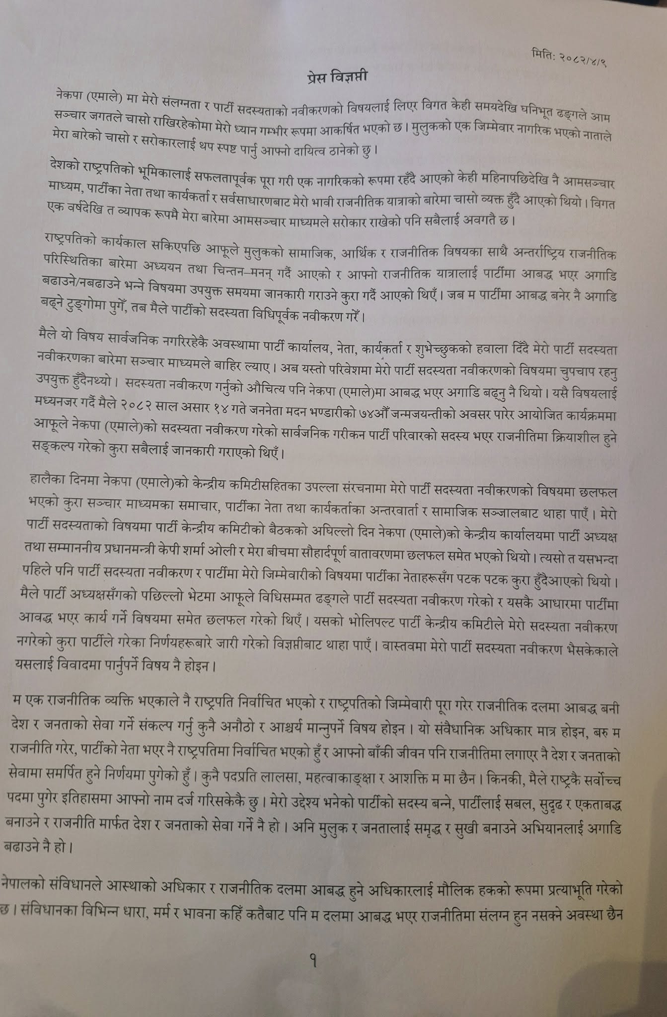 काठमाडौैं । पूर्वराष्ट्रपति विद्यादेवी भण्डारीले एमालेले पार्टी सदस्यता नवीकरण गरिसकेको विषय अनावश्यक विवादमा ल्याएको बताउँदै बबरमहलबाट पार्टी निर्माणमा जुट्न कार्यकर्तासँग आह्वान गरेकी छन् ।