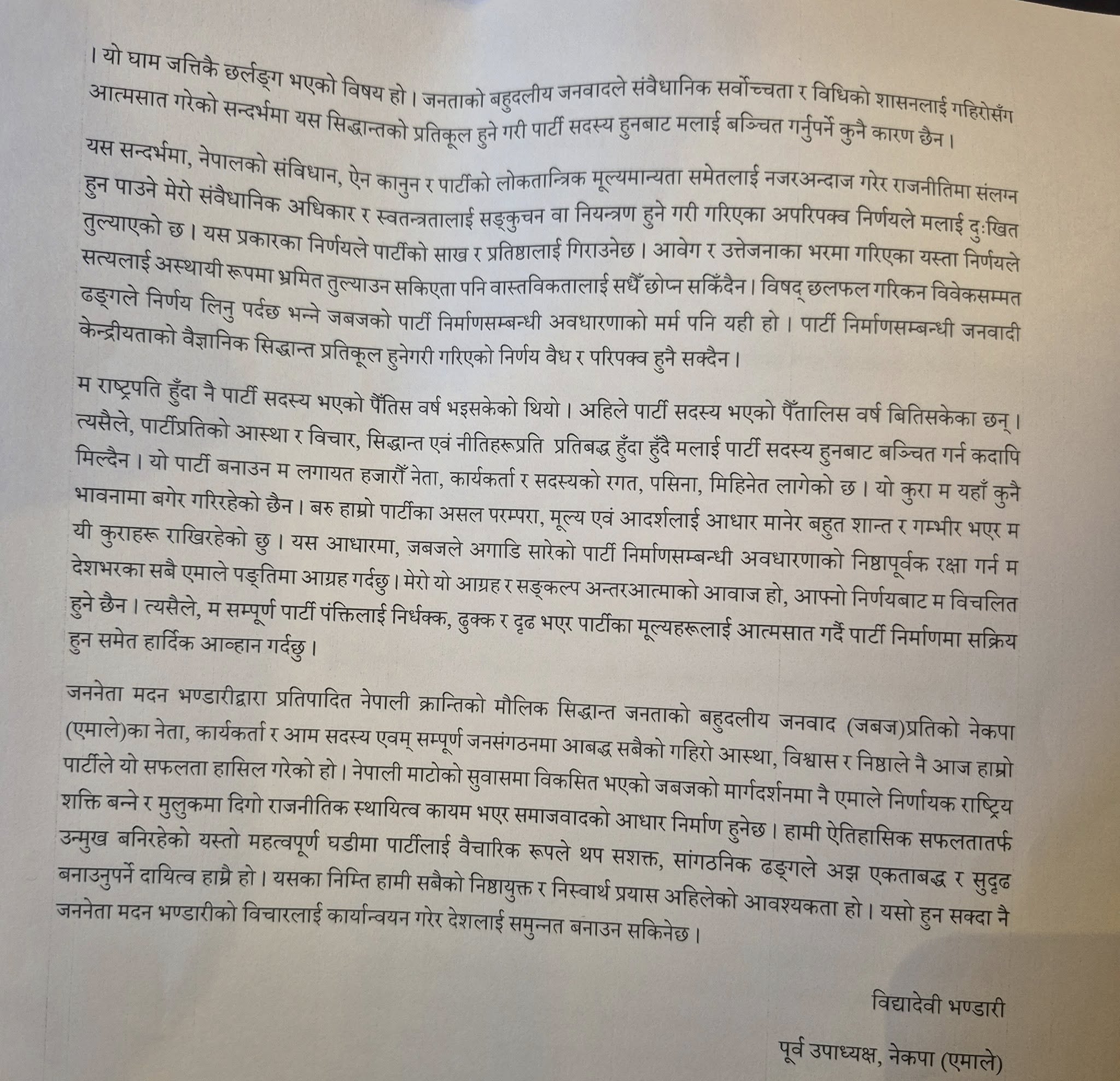 एमालेले पार्टी सदस्यता नै खारेज गरेपछि पहिलोपल्ट शुक्रबार पत्रकार सम्मेलन गर्दै उनले नयाँ पार्टी नखोल्ने, एमालेमै रहेर राजनीति गर्ने सन्देश दिएकी छन् । भण्डारीले आफू विचलित नहुने पनि बताइन्। ‘म सबै साथीहरूलाई पार्टीका मूल्यहरूलाई आत्मसात् गर्दै पार्टी निर्माणमा सक्रिय हुनका लागि आग्रह गर्दछु,’ उनले भनिन्, ‘पार्टी बनाउन म र मजस्ता हजारौंको हात छ।’
