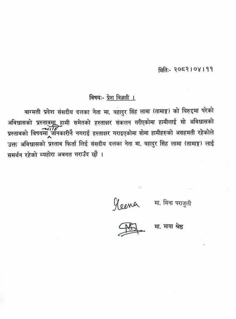 कांग्रेस प्रदेश सांसदद्वय मिना पराजुली र माया श्रेष्ठले विज्ञप्ति जारी गर्दै दलका नेता लामाविरुद्धको अविश्वास प्रस्तावका विषयमा कुनै जानकारी नै नगराई आफूहरूलाई हस्ताक्षर गराइएकोले त्यसमा आफूहरूको असहमति रहेको उल्लेख गरेका छन् ।