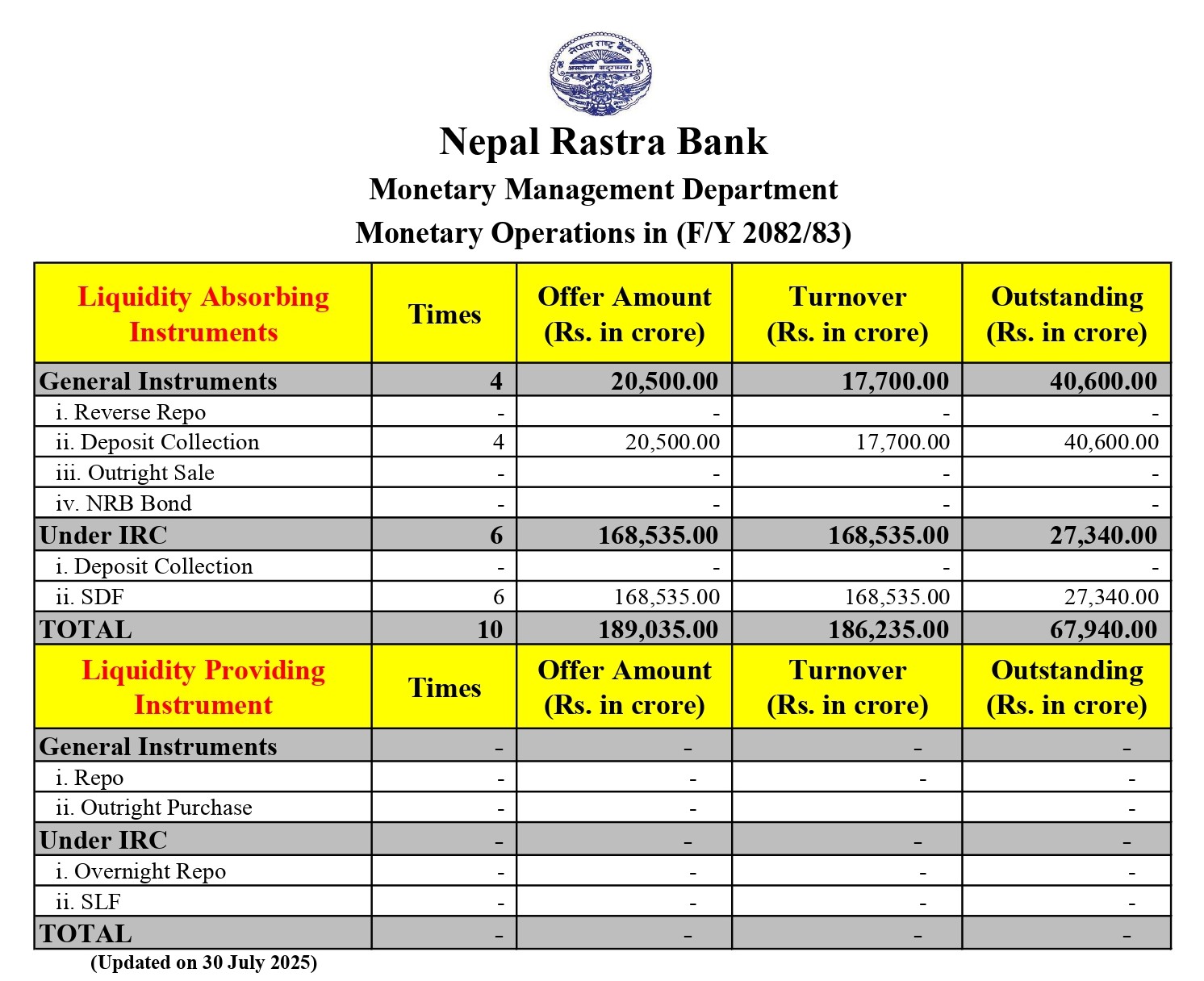 कुल रूपमा हेर्दा तरलता प्रशोचन गर्ने उपकरणबाट १८६ खर्ब २३ करोड ५० लाख रुपैयाँको कारोबार भएको छ भने हालसम्म ६७ खर्ब ९४ करोड रुपैयाँ अझै प्रणालीबाट प्रशोचित गरिएको अवस्थामा छ।