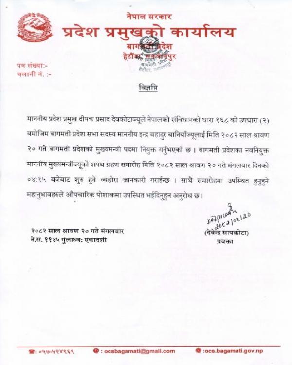 बानियाँका स्वकीय सचिव मिलन पुडासैनीले आजै दिउँसो ४ बजे प्रदेश प्रमुख कार्यालयमा सपथ ग्रहण हुने जानकारी गराएका छन् ।