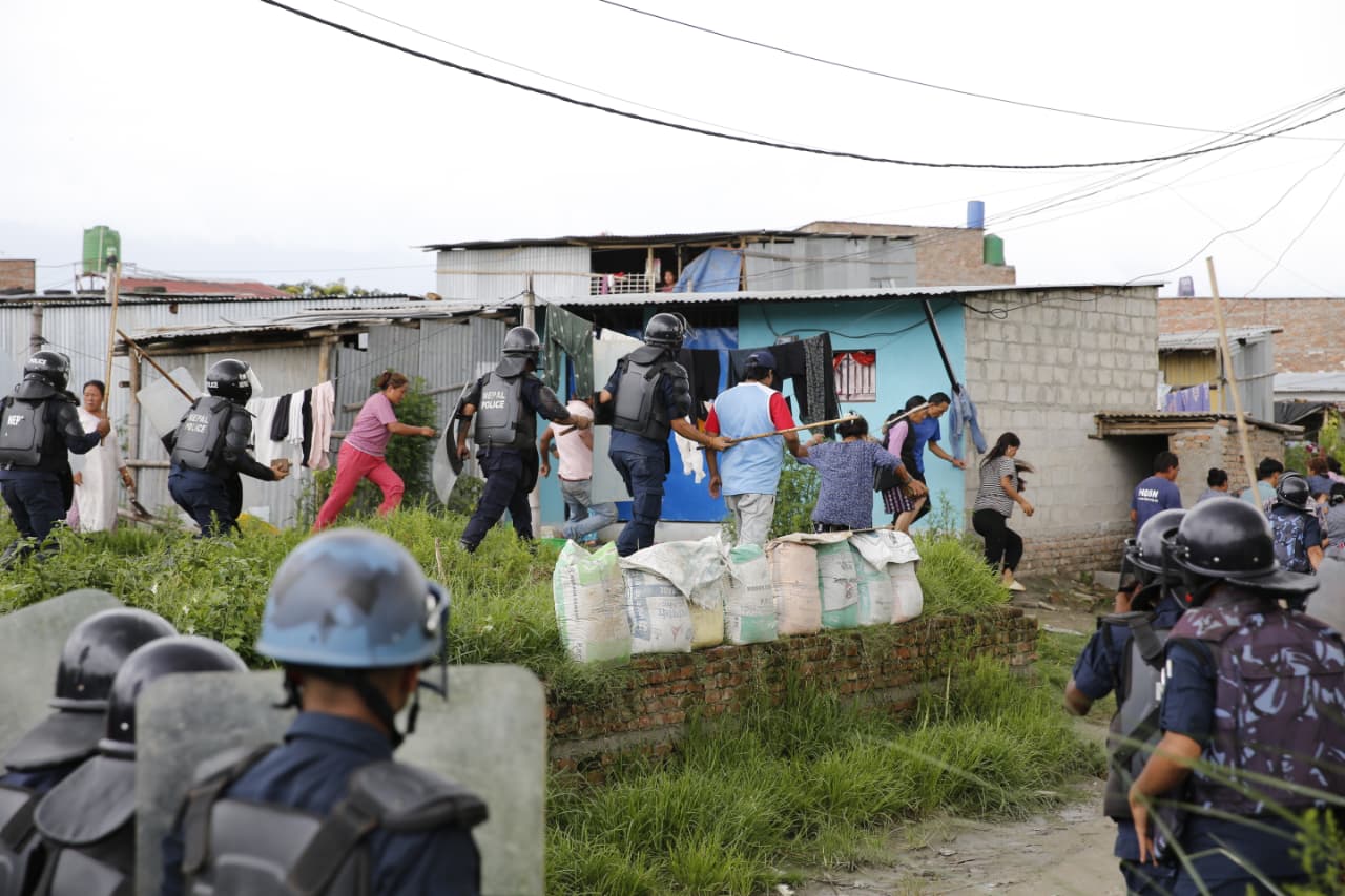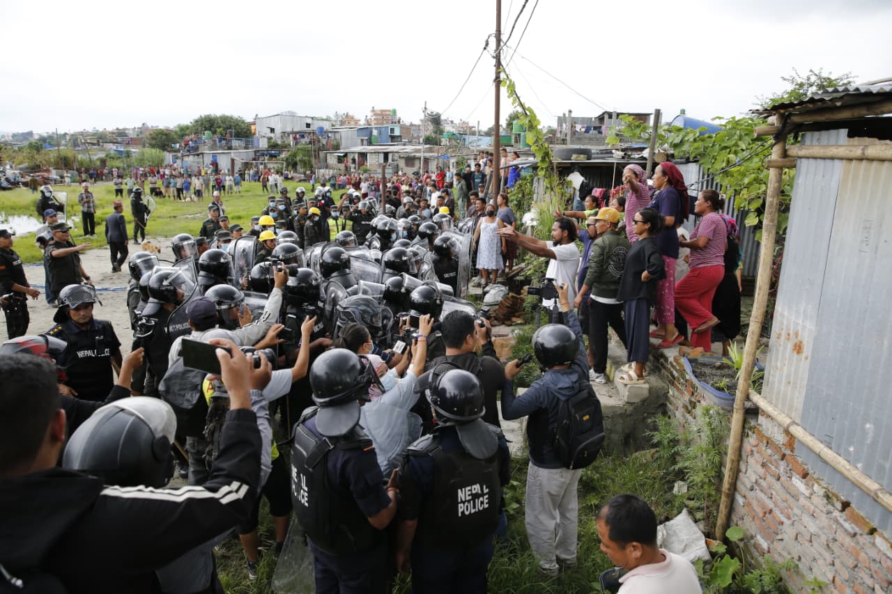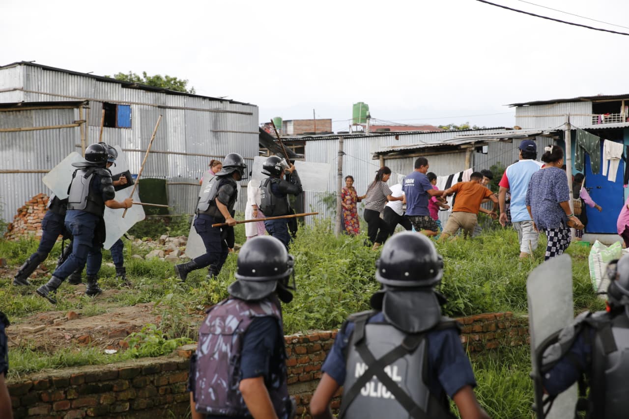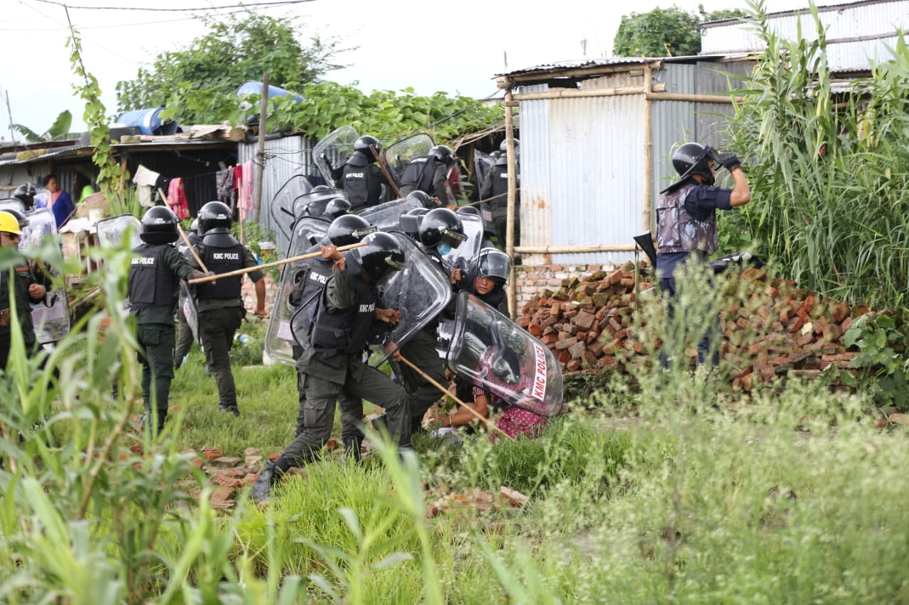स्थानीयले सुरक्षाकर्मीमाथि इँटा र ढुंगा प्रहार गरिरहेका छन् । सुरक्षाकर्मीले स्थनीयलाई पर हट्न चेतावनी दिइरहेको छ । लामो समयदेखि मनोहरा खोला किनारका सुकुम्बासी बस्ती हटाउन महानगरले खोजे पनि सफल भइरहेको छैन ।