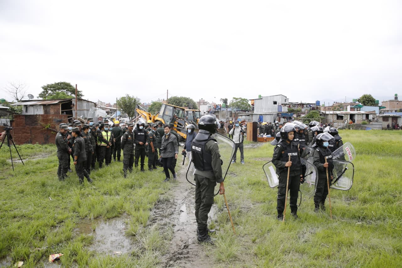 महानगर प्रहरी बल प्रमुख राजुराज पाण्डेको नेतृत्वमा सुकुम्बारी बस्तीमा डोजर चलाइएको छ । तर, स्थानीयले नाराबाजी गरिरहेका छन् ।