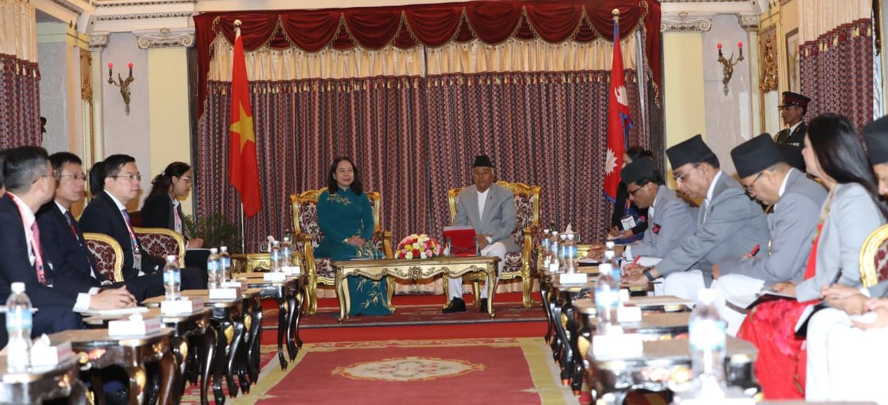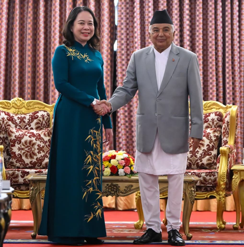 काठमाडौँ । राष्ट्रपति रामचन्द्र पौडेलसँग नेपाल भ्रमणमा रहेकी समाजवादी गणतन्त्र भियतनामका उपराष्ट्रपति वो थि आन्ह सुआनले सोमबार शिष्टाचार भेट गरेकी छिन । राष्ट्रपति भवन शीतल निवासमा भएको सो भेटमा राष्ट्रपति पौडेलले नेपाल र भियतनाम बिच व्यापार, पर्यटन, लगानी र प्रविधि हस्तान्तरणका क्षेत्रमा द्विपक्षीय आर्थिक सम्बन्ध प्रगाढ बनाउने धेरै सम्भावना रहेको बताएका छन् ।त्यसक्रममा उनले भने  “यसका लागि द्विपक्षीय सहकार्यलाई तीव्रता दिन नेपाल सरकार इच्छुक छ” ।