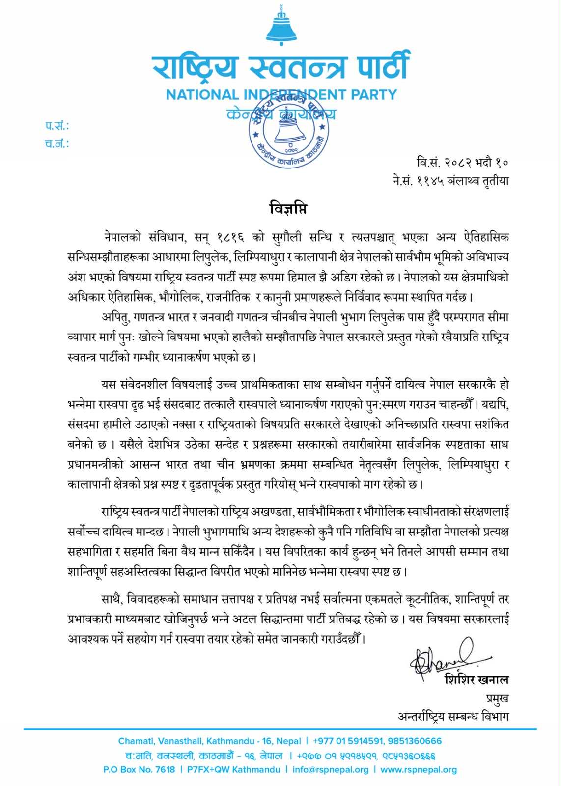 नेपालको यस क्षेत्रमाथिको अधिकार ऐतिहासिक, भौगोलिक, राजनीतिक र कानुनी प्रमाणहरूले निर्विवाद रूपमा स्थापित गरेको रास्वपा अन्तर्राष्ट्रिय सम्बन्ध विभाग प्रमुख खनालले जारी गरेको विज्ञप्तिमा छ ।