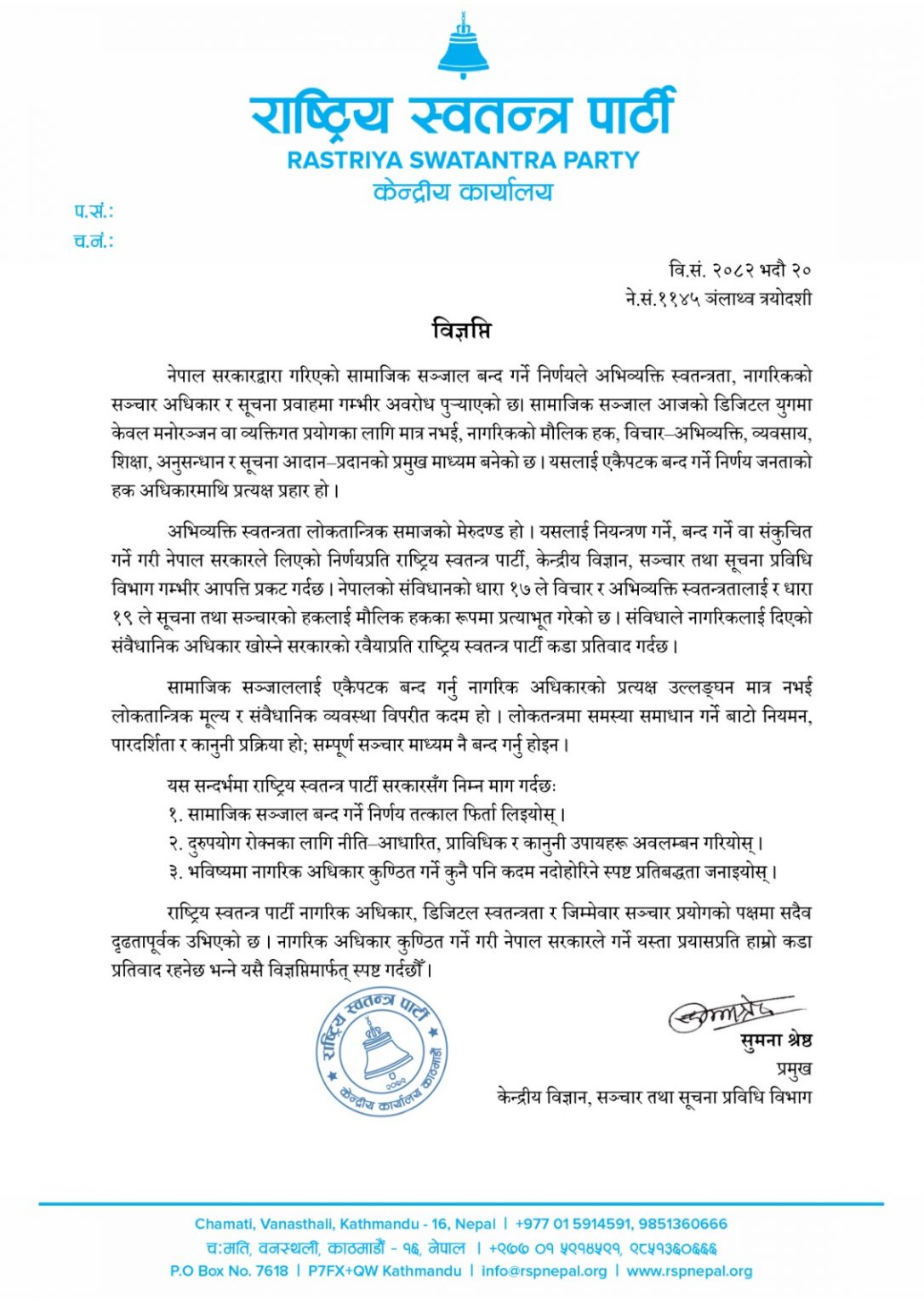 रास्वपा केन्द्रीय विज्ञान, सञ्चार तथा सूचना प्रविधि विभाग प्रमुख सुमना श्रेष्ठले शुक्रबार विज्ञप्ति जारी गर्दै सरकारद्वारा गरिएको सामाजिक सञ्जाल बन्द गर्ने निर्णयले अभिव्यक्ति स्वतन्त्रता, नागरिकको सञ्चार अधिकार र सूचना प्रवाहमा गम्भीर अवरोध पु¥याएको बताएकी छन् ।