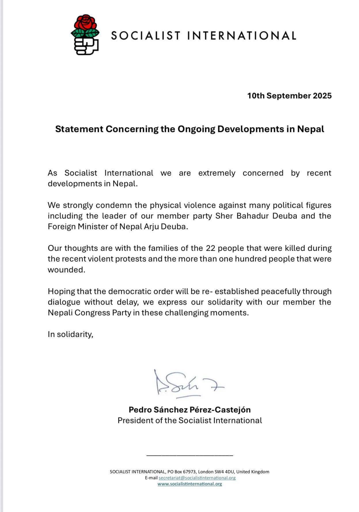 विश्वका ८३ देशका ९१ वटा राजनीतिक पार्टी सदस्य रहेको सोसलिष्ट इन्टरनेसनलले वक्तव्यमार्फत जेनजीको प्रदर्शनका क्रममा भदौ २४ गते देउवा दम्पतीलगायत राजनीतिक व्यक्तित्वमाथि भएको भौतिक हिंसाको निन्दा गरेको हो । सोसलिष्ट इन्टरनेसनलका अध्यक्ष पेद्रो साञ्चेज पेरेज–कास्तेजोनले वक्तव्य जारी गर्दै उक्त घट्नाक्रमबारे चिन्ता व्यक्त गरेका हुन् ।