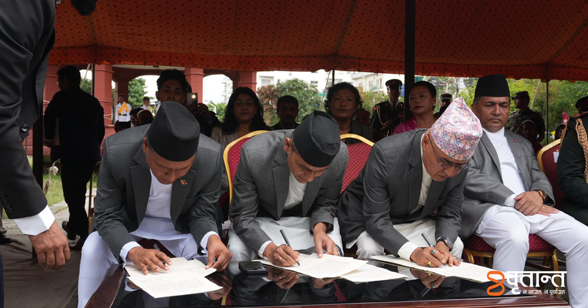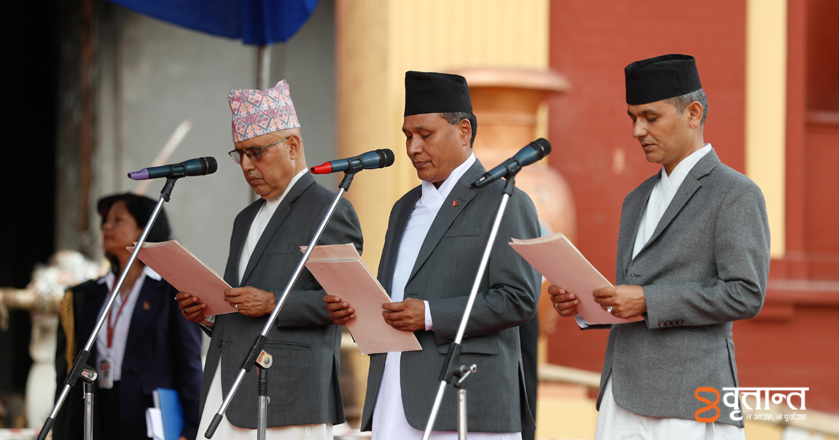 काठमाडौं । नवनियुक्त अर्थमन्त्री रामेश्वर खनाल, गृहमन्त्री ओमप्रकाश अर्याल र ऊर्जामन्त्री कुलमान घिसिङले पद तथा गोपनीयताको सपथ लिएका छन् ।