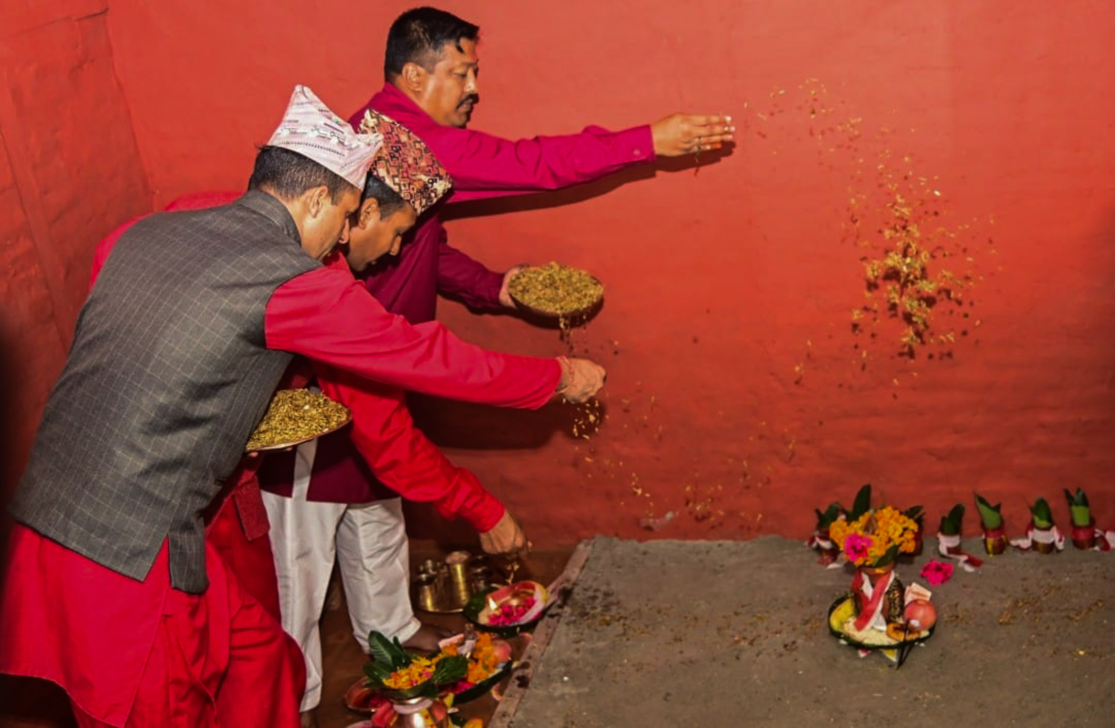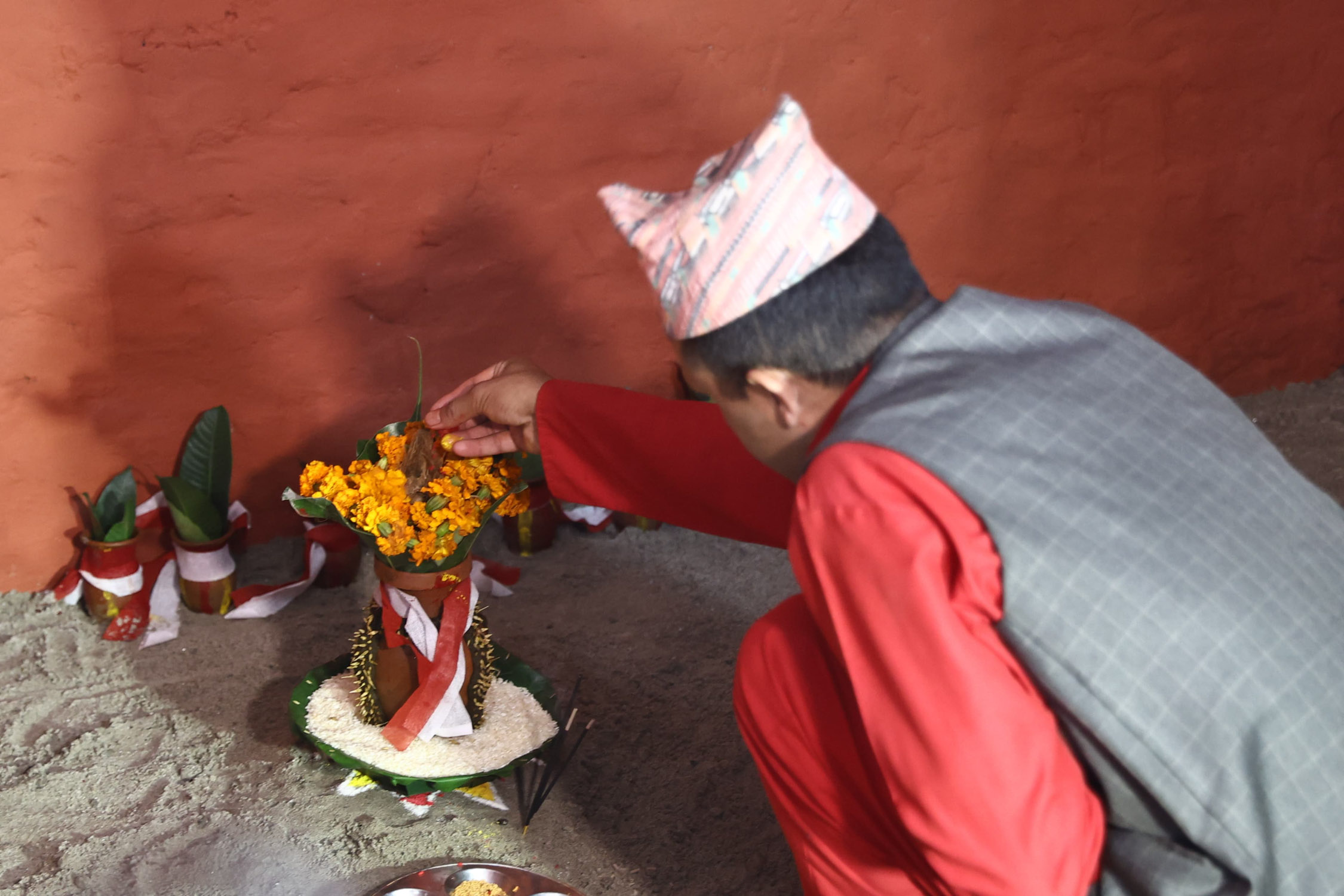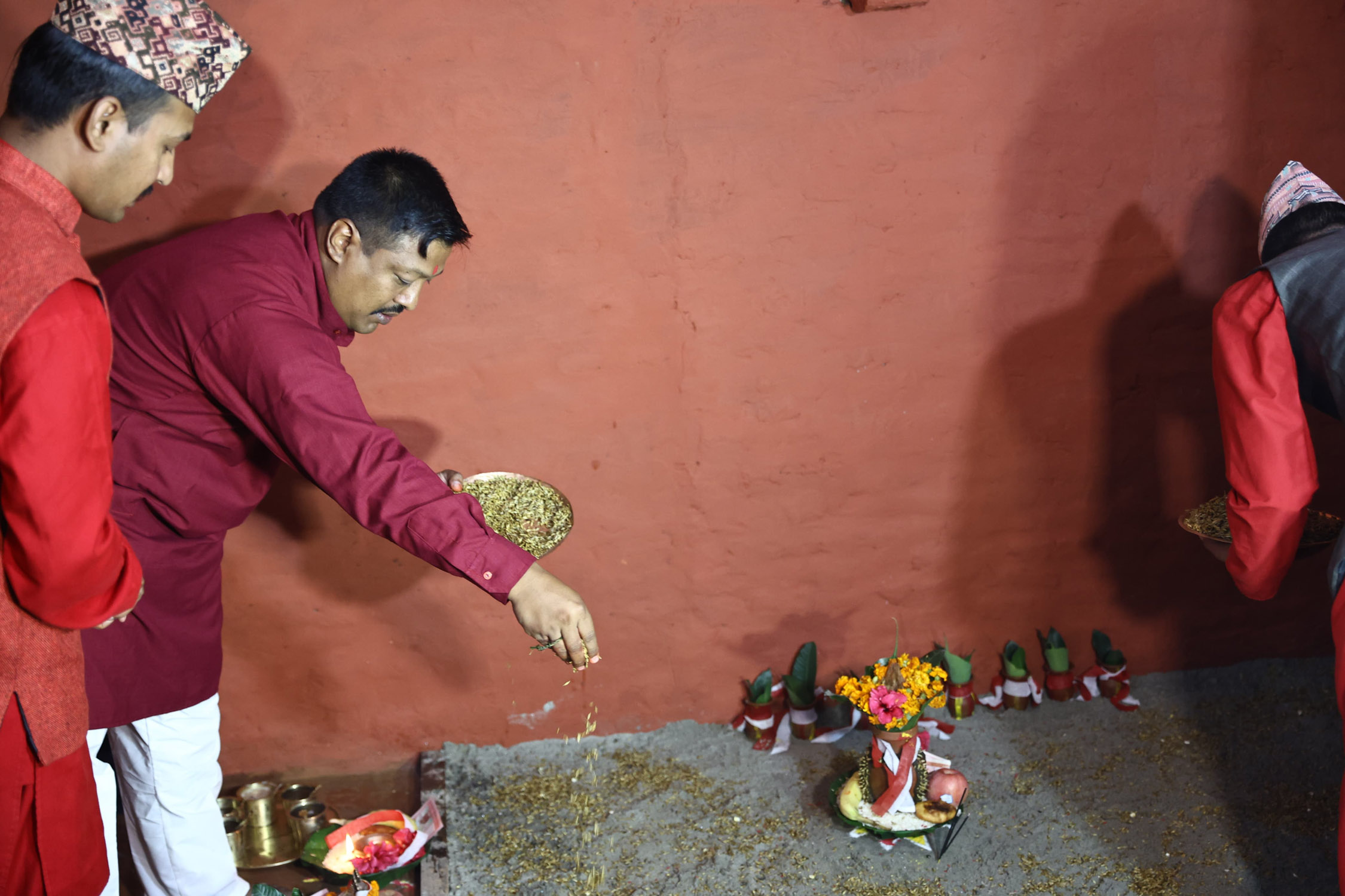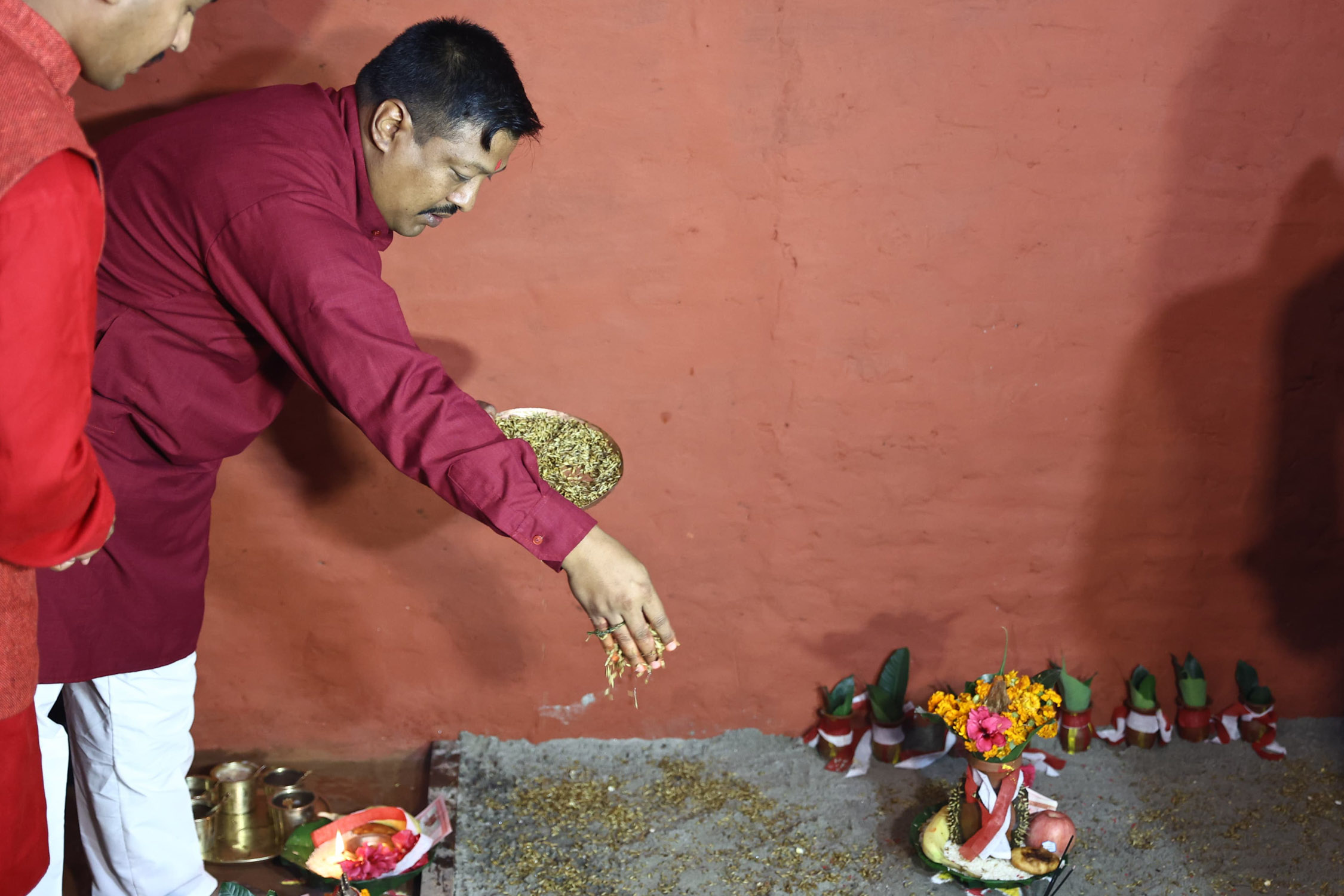 बिहानै नृत्य कर्म समाप्त गरी नजिकको नदी वा चोखो स्थलबाट बालुवा, माटो ल्याई गाईको गोबरले लिपपोत गरिएको पूजा कोठा वा दसैं घरमा विधिपूपर्वक जौ, मकैको जमरा राख्ने गरिन्छ । आजैदेखि दसैं घरमा शक्तिकी अधिष्ठात्री देवी दुर्गाको आह्वान गरी पूजा आरम्भ हुन्छ ।