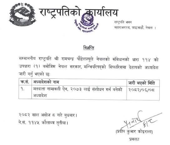 काठमाडौं । राष्ट्रपति रामचन्द्र पौडेलले आगामी फागुन २१ गते हुने निर्वाचनका लागि ‘मतदाता नामावली ऐन २०७३ लाई संशोधन गर्न बनेको अध्यादेश’ जारी गरेका छन् ।