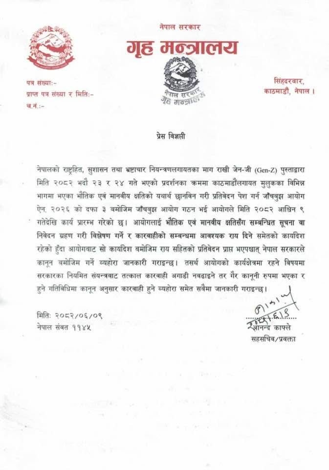 गृह मन्त्रालयले पनि जेनजी आन्दोलनको न्यायिक छानबिन आयोग बनेकाले त्यसको आधारमा मात्रै कारबाही गर्नुपर्ने भन्दै विज्ञप्ति जारी गरेको छ। जसले गर्दा अहिले पक्राउ परेका केही व्यक्तिहरू पनि छुटिसकेको स्रोतको दाबी छ।