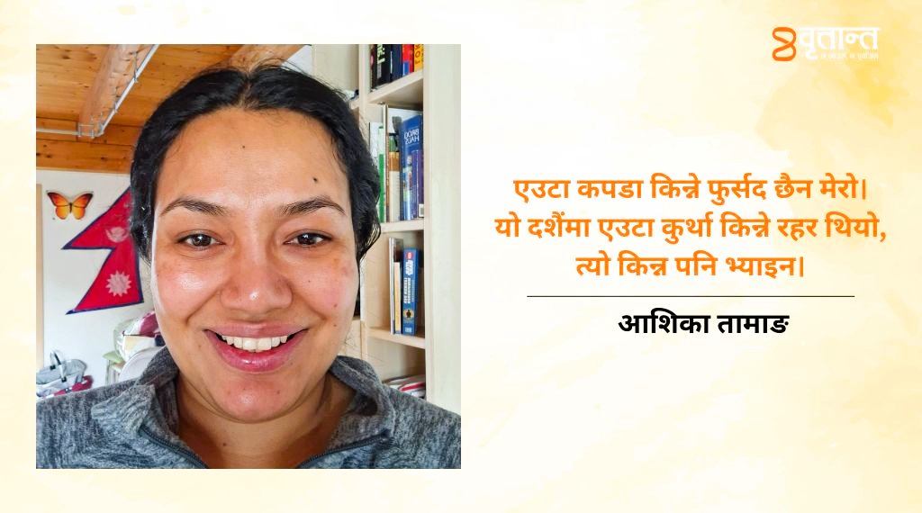 “एउटा कपडा किन्ने फुर्सद छैन मेरो। यो दशैंमा एउटा कुर्था किन्ने रहर थियो, त्यो किन्न पनि भ्याइन। तीन पटक शनिबार बैंकमा गएर पनि बिदा भएको कारण पैसा लिन पाइनँ। बल्ल घाइते भाइहरू घर फर्केपछि थोरै समय पाएकी छु।”