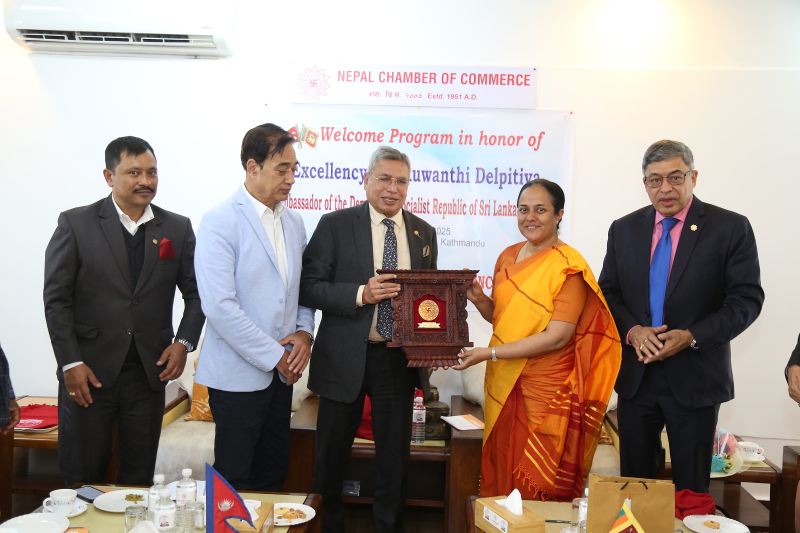 काठमाडौँ । नेपाल चेम्बर अफ कमर्सका पदाधिकारी र नेपालका लागि श्रीलङ्काका राजदूत रुवान्थी डेल्पितीयाबीच दुई देशबीचको व्यापार सहजीकरण तथा हवाई सेवा विस्तारका विषयमा आज काठमाडौँमा छलफल भएको छ ।