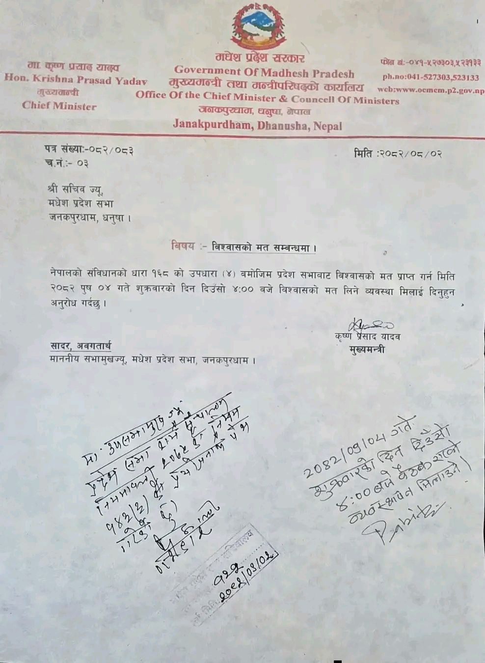काठमाडौं । मधेश प्रदेशका मुख्यमन्त्री कृष्णप्रसाद यादवले पुस ४ गते (शुक्रबार) विश्वासको मत लिने भएका छन् । विश्वासको मतका लागि वातावरण बनाइदिन भन्दै मुख्यमन्त्री कार्यालयले बुधबार मधेश प्रदेश सभामा पत्र दर्ता गरेको छ । यादवले शुक्रबार दिउँसो ४ बजे विश्वासको मत लिने कार्यक्रम छ ।