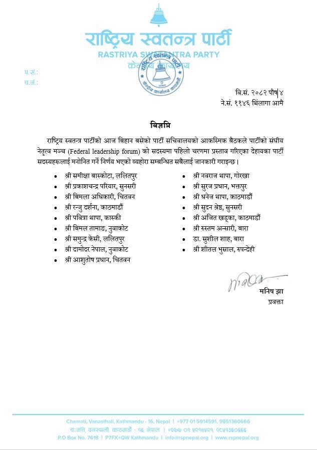 काठमाडौँ । राष्ट्रिय स्वतन्त्र पार्टीले पार्टीकोे संघीय नेतृत्व मञ्चमा १७ जना सदस्य मनोनीत गरेको छ । शुक्रबार बिहान बसेको पार्टी सचिवालयको आकस्मिक बैठकले मञ्चमा सदस्य मनोनयन गरेको प्रवक्ता मनिष झाले जानकारी दिए ।