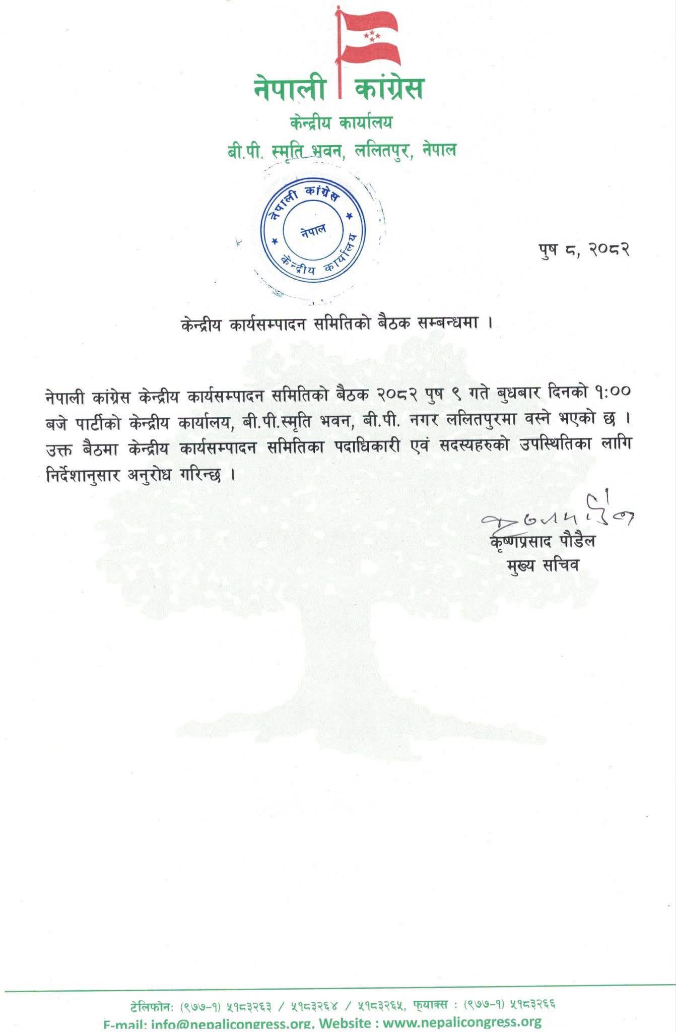 मुख्य सचिव कृष्णप्रसाद पौडेलद्वारा जारी सूचनाअनुसार बैठकमा केन्द्रीय कार्यसम्पादन समितिका पदाधिकारी तथा सदस्यहरूको उपस्थितिका लागि अनुरोध गरिएको छ।