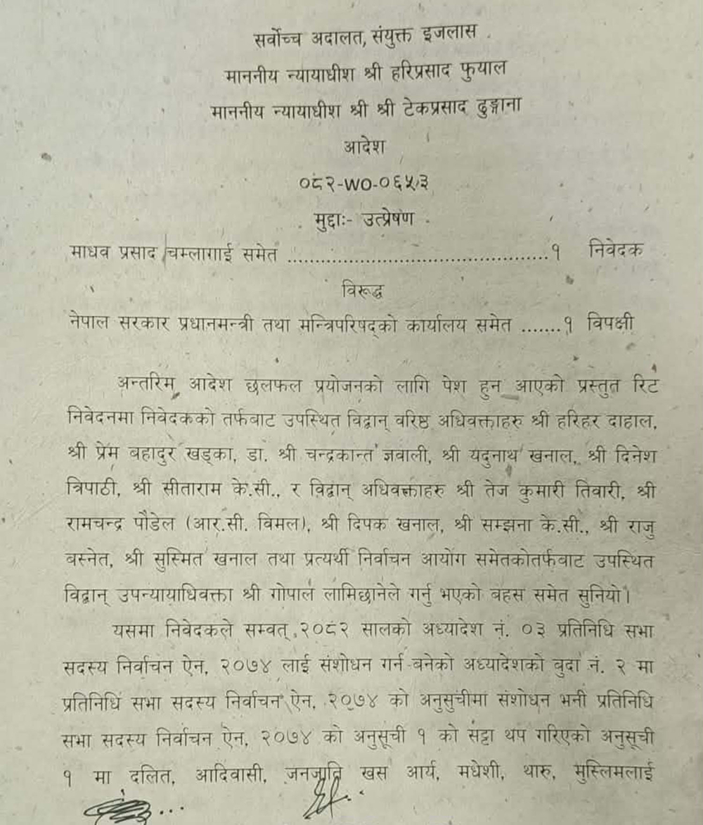 ‘निर्वाचन आयोगले सबै राजनीतिक दलले पेस गरेको उम्मेदवारको बन्दसूचीमा अपांगता भएका व्यक्तिहरूको प्रतिनिधित्व सुनिश्चितता हुने गरी उम्मेदवारको बन्दसूची तयार गरी पेस गरे नगरेको प्रतिनिधिसभा सदस्य निर्वाचन ऐन, २०७४ को दफा २८ (१०) बमोजिम छानबिन गरी कुनै दलले पेस गरेको बन्दसूचीमा संविधान र कानून बमोजिम अपांगता भएका व्यक्तिहरूको प्रतिनिधित्व नभएको देखिएमा त्यस्तो दललाई उम्मेदवारको बन्दसूची सच्चाइ अपांगता भएका व्यक्तिहरूको नामसमेत समावेश गर्नु गराउनु भनी सूचित गरी निर्वाचनमा संविधान, कानून र यस अदालतबाट जारी आदेश परिपालन हुने सुनिश्चित गर्नु भनी विपक्षी निर्वाचन आयोगको नाममा सर्वोच्च अदालत नियमावली, २०७४ को नियम ४९ (१) बमोजिम यो अन्तरिम आदेश जारी गरिएको छ,’ आदेशमा उल्लेख छ ।
