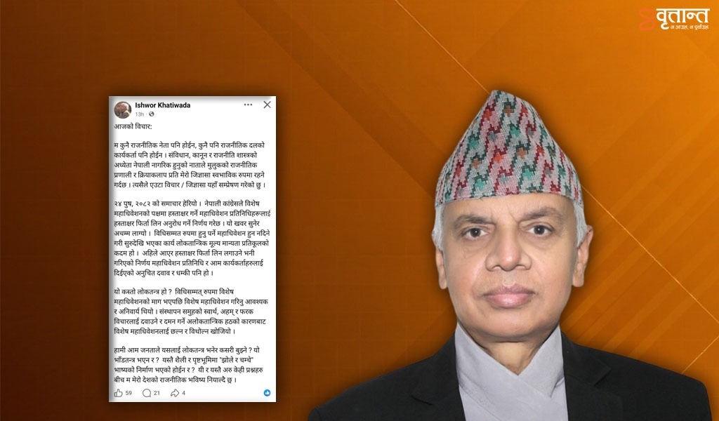 विधिसम्मत् रुपमा विशेष महाधिवेशनको माग भएपछि विशेष महाधिवेशन गरिनु आवश्यक र अनिवार्य नै भएको उनको भनाइ छ । ‘संस्थापन समूहको स्वार्थ, अहम् र फरक विचारलाई दवाउने र दमन गर्ने अलोकतान्त्रिक हठको कारणबाट विशेष महाधिवेशनलाई छल्न र विथोल्न खोजियो । हामी आमजनताले यसलाई लोकतन्त्र भनेर कसरी बुझ्ने ? यो भाँडतन्त्र भएन र ? यस्तै शैली र पृष्टभूमिमा झोले र चम्चे भाष्यको निर्माण भएको होईन र ? यी र यस्तै अरु केही प्रश्नहरुबीच म मेरो देशको राजनीतिक भविष्य नियाल्दै छु,’ खतिवडाले शुक्रबार सामाजिक सञ्जालमा लेखेका छन् ।