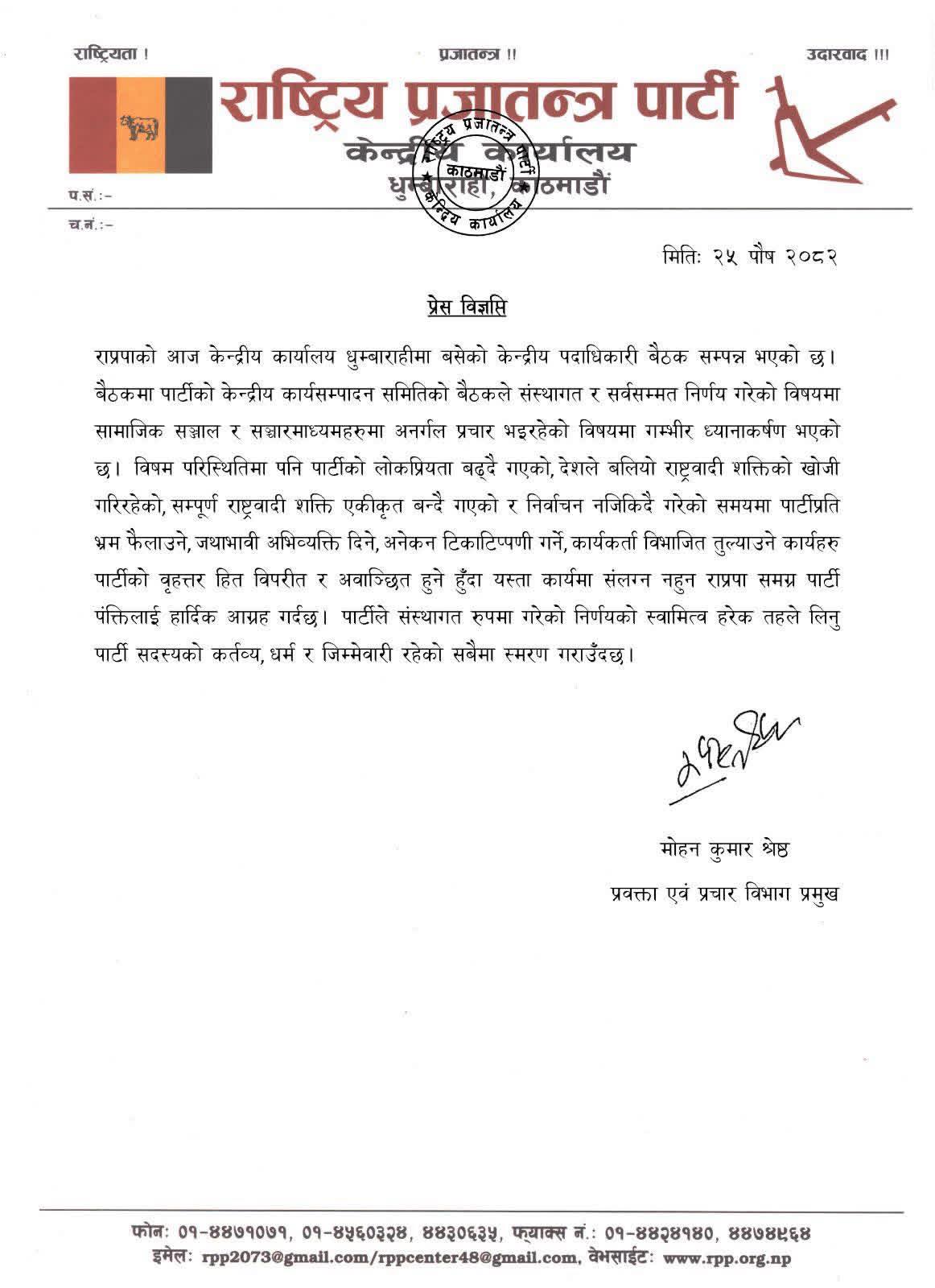 राप्रपाले भने केन्द्रीय कार्यसम्पादन समितिको बैठकले संस्थागत र सर्वसम्मत निर्णय गरेको विषयमा सामाजिक सञ्जाल र सञ्चारमाध्यमहरुमा अनर्गल प्रचार भइरहेको विषयमा पार्टीको गम्भीर ध्यानाकर्षण भएको जनाएकाे छ।