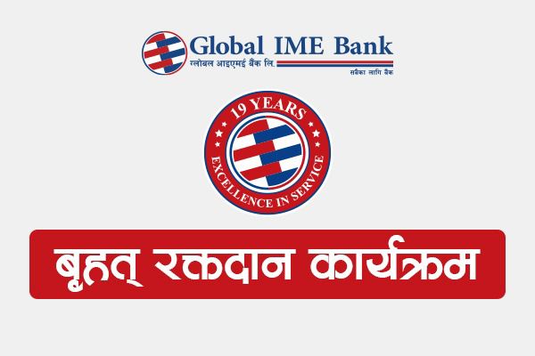 काठमाडौं। ग्लोबल आइएमई बैंक लिमिटेडले आफ्नो १९औँ वार्षिकोत्सवको अवसरमा सातै प्रदेशमा रक्तदान कार्यक्रम आयोजना गरेको छ। बैंकले स्थापनाको १९औं वार्षिकोत्सवका अवसरमा घोषणा गरेका १९ वटा सामाजिक उत्तरदायित्वका कार्यक्रममध्ये यो रक्तदान कार्यक्रम एक महत्वपूर्ण पहल हो।