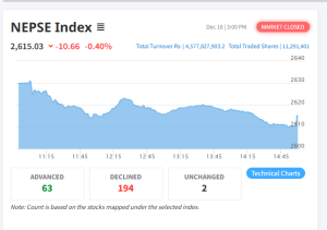 काठमाडौं । साताको तेस्रो कारोबार दिन मंगलबार नेप्से दोहोरो अंकले बढेको छ । नेपाल स्टक एक्सचेन्ज (नेप्से) परिसूचक २१.६२ अंकले बढेर २६३८.६० विन्दुमा पुगेको छ। नेप्से बढे पनि कारोबार रकम भने अघिल्लो दिनको तुलनामा घटेको छ ।