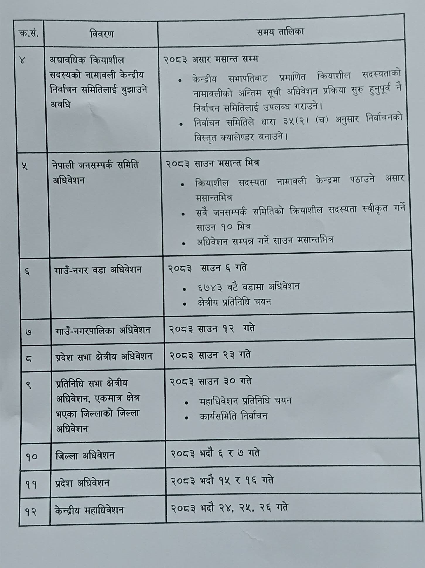 यस्तै, साउन ६ गते गाउँपालिका र नगरपालिकाका ६७४३ वडा अधिवेशन, गाउँ–नगरपालिका अधिवेशन साउन १२, प्रदेश तथा क्षेत्रीय अधिवेशन साउन २२ र जिल्ला अधिवेशन साउन ३० गते हुने कार्यतालिका ल्याइएको छ ।