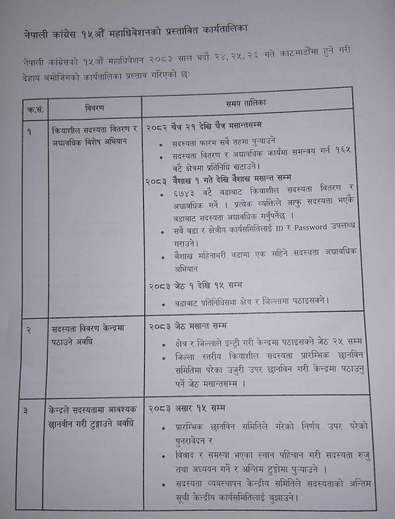 कांग्रेसले महाधिवेशनको कार्यतालिका पनि सार्वजनिक गरेको छ । चैत २१ गतेदेखि नै क्रियाशील सदस्यता नवीकरण र अद्यावधिक सुरु हुने भएको छ । वैशाख १ मसान्तसम्म सबै वडामा सदस्यता अद्यावधिक गर्ने, जेठ १ देखि १५ सम्म जिल्लामा पठाउने, २५ गतेसम्म केन्द्रमा सदस्यता पठाउने र २०८३ असार १५ सम्म केन्द्रले छानबिन गरी अवधि टुंगो लगाउने प्रस्ताव गरेका छन् ।
