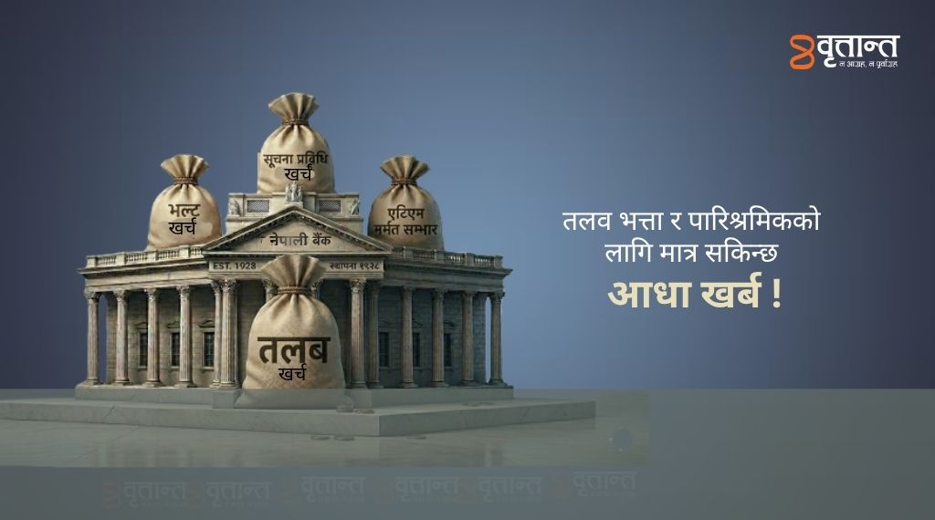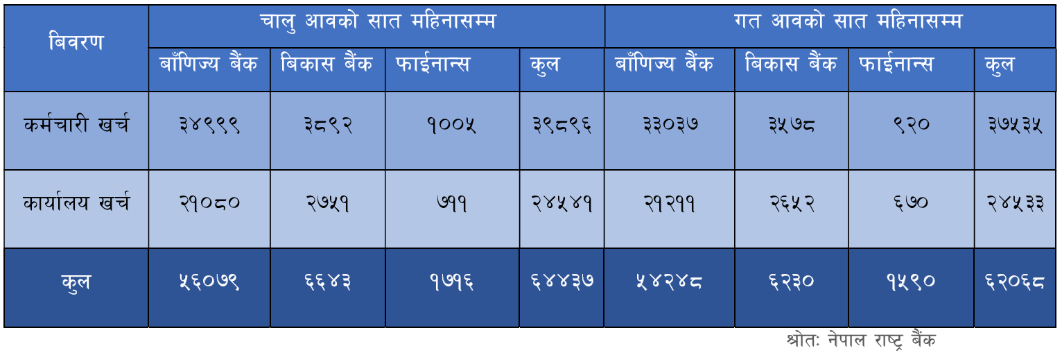 राष्ट्र बैंकका अनुसार चालु आवको पछिल्लो सात महिनाको अवधिमा बाँणिज्य बैंकहरुले मात्र कर्मचारीहरुको तलव भत्ताको लागि ३४ अर्ब ९९ करोड ९० लाख र कार्यालय व्यवस्थापनको लागि २१ अर्ब आठ करोड रुपैंयाँ समेत गरी कुल ५६ अर्ब सात करोड ९० लाख रुपैंयाँ खर्च गरेको देखिएको छ । यो खर्च गत आवको सोही अवधिको तुलनामा एक अर्ब ८३ करोड १० लाख रुपैंयाँले बढी हो । गत आवको सोही अवधिमा बाँणिज्य बैंकहले कर्मचारीहरुको तलव भत्ताको लागि ३३ अर्ब तीन करोड ७० लाख र कार्यालय व्यवस्थापनको लागि २१ अर्ब २१ करोड १० लाख रुपैंयाँ समेत गरी कुल ५४ अर्ब २४ करोड ८० लाख रुपैंयाँ खर्च गरेका थिए ।