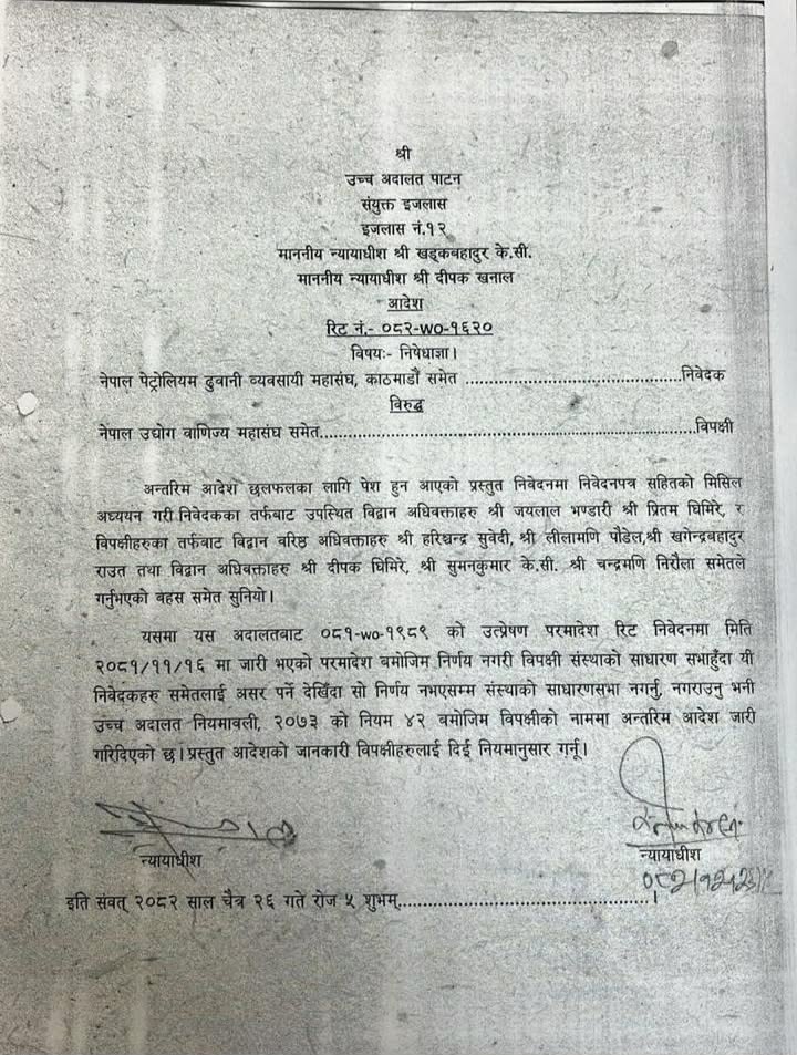 रिटमा चैत २३ गते न्यायाधीश स्वीकृति पराजुलीको एकल इजलासले कारण देखाऊ आदेश र अल्पकालीन अन्तरिम आदेश जारी हुने आदेश दिएको थियो। बिहीबार उच्च अदालतले सोही आदेशले निरन्तरता पाउने गरी अन्तरिम आदेश जारी गरेको हो ।