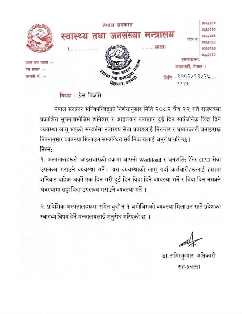 ‘अस्पतालहरूले आइतबारको हकमा आफ्नो वर्कलोड (कामको चाप) र जनशक्ति हेरेर ओपीडी सेवा उपलब्ध गराउने व्यवस्था गर्ने,’ मन्त्रालयले जारी गरेको विज्ञप्तिमा उल्लेख छ, ‘यस व्यवस्थाको लागु गर्दा कर्मचारीहरूलाई हप्तामा शनिबारबाहेक अर्को एक दिन गरी दुई दिन बिदा दिने व्यवस्था गर्ने र बिदा दिन नसक्ने अवस्थामा सट्टा बिदा उपलब्ध गराउने व्यवस्था गर्ने ।’