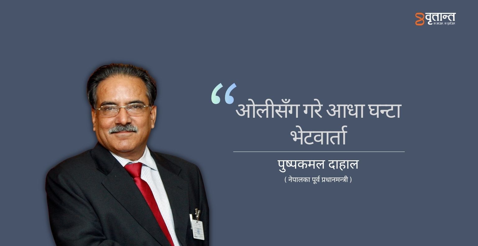 यसैक्रममा नेकपाका संयोजक पुष्पकमल दाहाल प्रचण्ड एमाले अध्यक्ष केपी ओलीलाई भेट्न अस्पताल पुगेका छन् । पत्थरीको अपरेसनपछि टिचिङ अस्पतालमा उपचाररत ओलीलाई प्रचण्डले बिहीबार साँझ सवा ५ बजे भेटेका थिए । दुवैबीच ३० मिनेट कुराकानी भएको बताइएको छ । प्रचण्डले ओलीलाई स्वास्थ्यलाभको कामना गरेका थिए । तर ओली र प्रचण्डबीचको भेटवार्ताबारे बाहिर ल्याइएन । दुवैबीच कसरी अगाडि बढ्ने भन्ने विषयमा छलफल भएको बताइन्छ ।