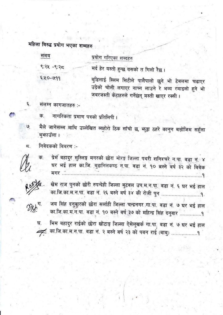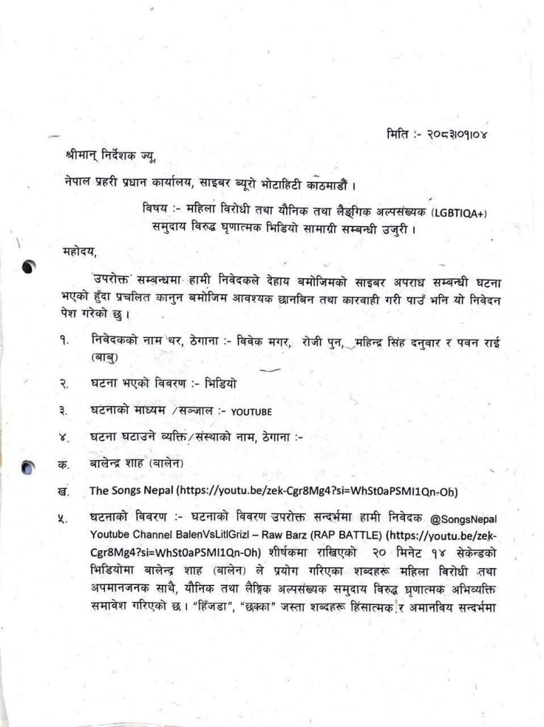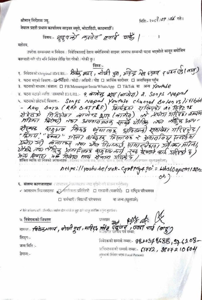 मोरङ, रुपन्देही, सर्लाही र खोटाङ स्थायी घर भएका विवेक मगर, रोजी पुन, महिन्द्र सिंह दनुवार र पवन राई (बाबु) ले संयुक्त रूपमा दिएको उजुरीमा युट्युबमार्फत प्रसारित एक भिडियोमा गम्भीर आपत्तिजनक शब्द प्रयोग भएको दाबी गरिएको छ । उक्त उजुरी २०८३ साल वैशाख ४ गते नेपाल प्रहरी प्रधान कार्यालय अन्तर्गतको साइबर ब्यूरो, भोटाहिटीमा पेश गरिएको हो ।