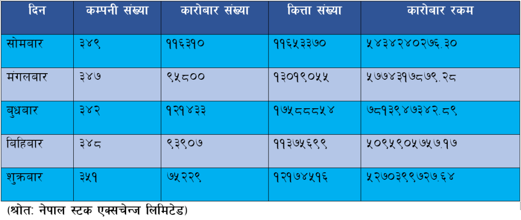 धितोपत्र बजारमा यो साता तीन सय ५१ वटा कम्पनीहरुको पाँच लाख दुई हजार छ सय ७९ पटकको कारोबारमा छ करोड ५८ लाख ११ हजार चार सय ९४ कित्ता शेयर किनबेच भएका छन् । जसबाट कुल कुल कारोबार रकम २९ अर्ब ३८ करोड ८८ लाख १० हजार नौं सय चार ८३ रुपैयाँ कायम भएको छ । यो कारोबार रकम गत साताको तुलनामा छ अर्ब रुपैंयाँले कम हो । गत साता तीन सय ४४ वटा कम्पनीहरुको चार लाख ३२ हजार सात सय १९ पटकको कारोबारमा सात करोड ५४ लाख नौं हजार नौं सय २६ कित्ता शेयर किनबेच भएका थिए । जसबाट उक्त साता कुल कारोबार रकम ३५ अर्ब ९७ करोड ६१ लाख ३६ हजार तीन सय चार ४५ रुपैयाँ पुगेको थियो ।