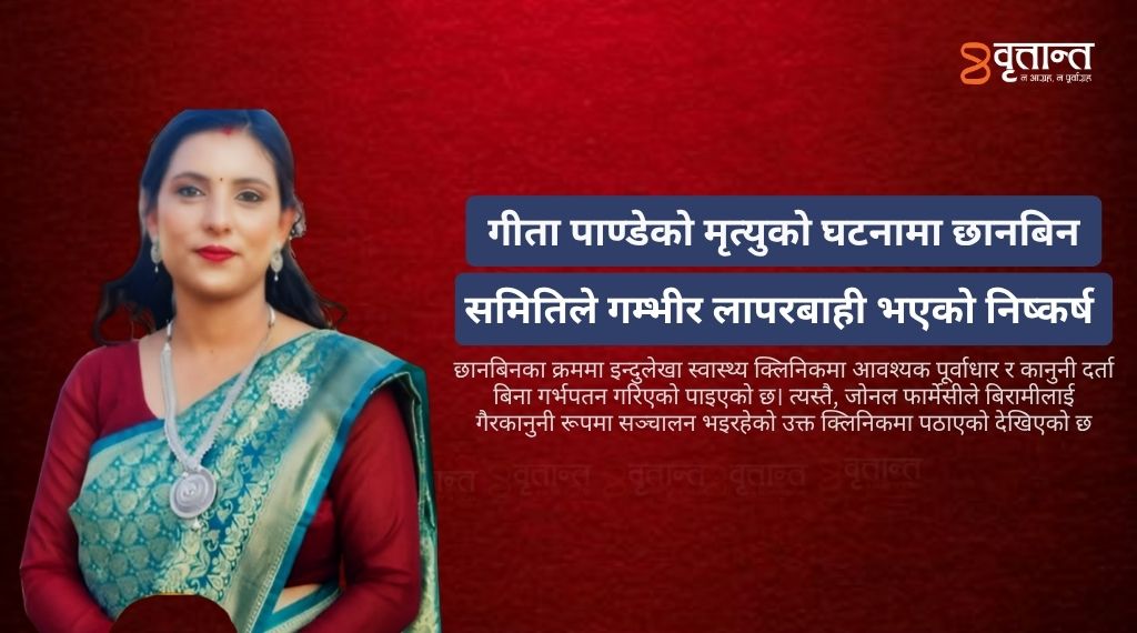 काठमाडौं/बुटवल। गर्भपतनका क्रममा २९ वर्षीया गीता पाण्डेको मृत्यु भएको घटनामा छानबिन समितिले गम्भीर लापरबाही भएको निष्कर्ष निकाल्दै नेपाल मेडिकल काउन्सिलले संलग्न चिकित्सक र स्वास्थ्य संस्थामाथि कारबाही अघि बढाएको छ।