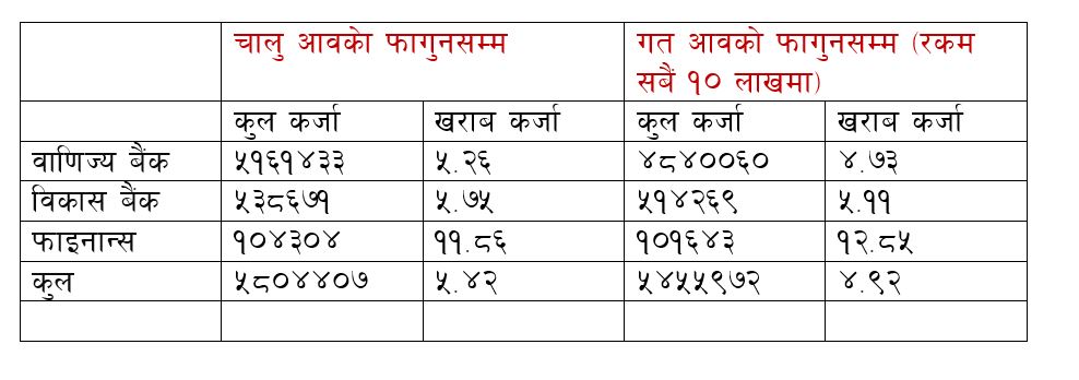 फाइनान्स कम्पनीहरूमा भने समस्या अझ गम्भीर देखिएको छ। चालू आवको फागुनसम्म १ खर्ब ३७ अर्ब १५ करोड निक्षेप संकलन गरी १ खर्ब ४ अर्ब ३० करोड कर्जा प्रवाह भएकोमा ११.८६ प्रतिशत अर्थात् १२ अर्ब ३७ करोड खराब कर्जा रहेको छ। यद्यपि अघिल्लो वर्षको १२.८५ प्रतिशतको तुलनामा केही सुधार भए पनि यो दर अझै उच्च मानिन्छ।
